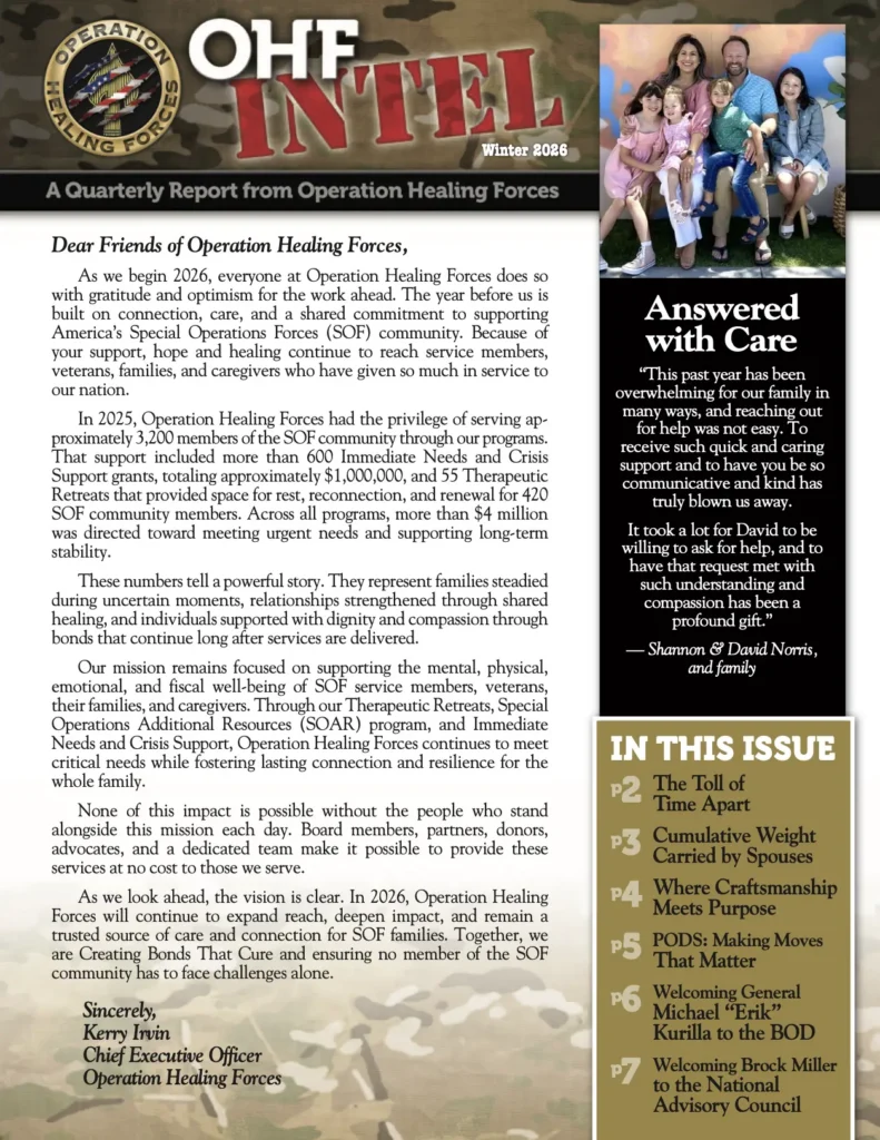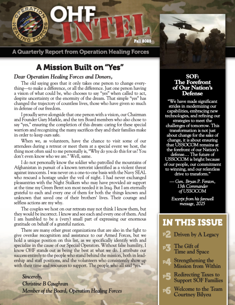 "Operation Healing Forces began in 2011 to aid America’s most elite warriors, Special Operations Forces and their families. This organization has now become my legacy."